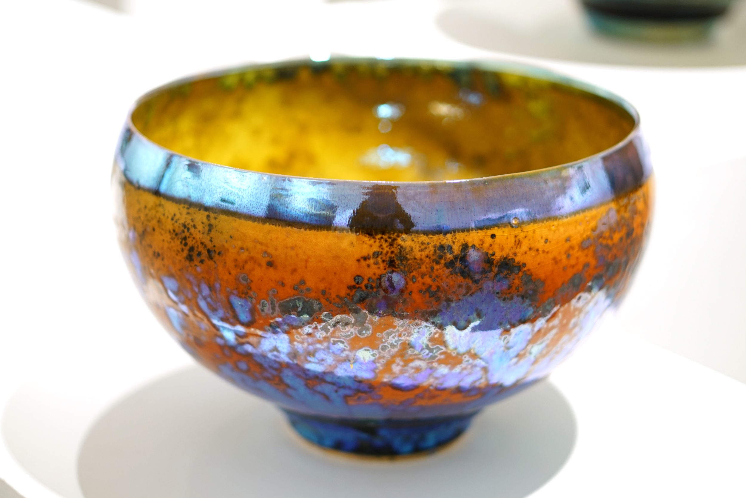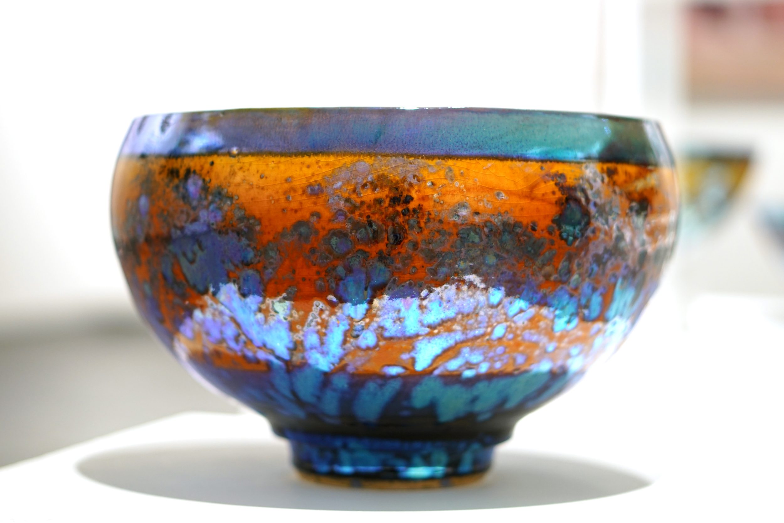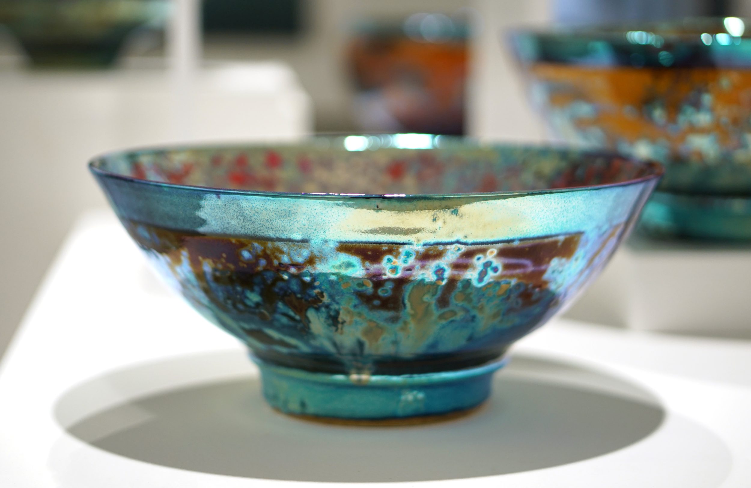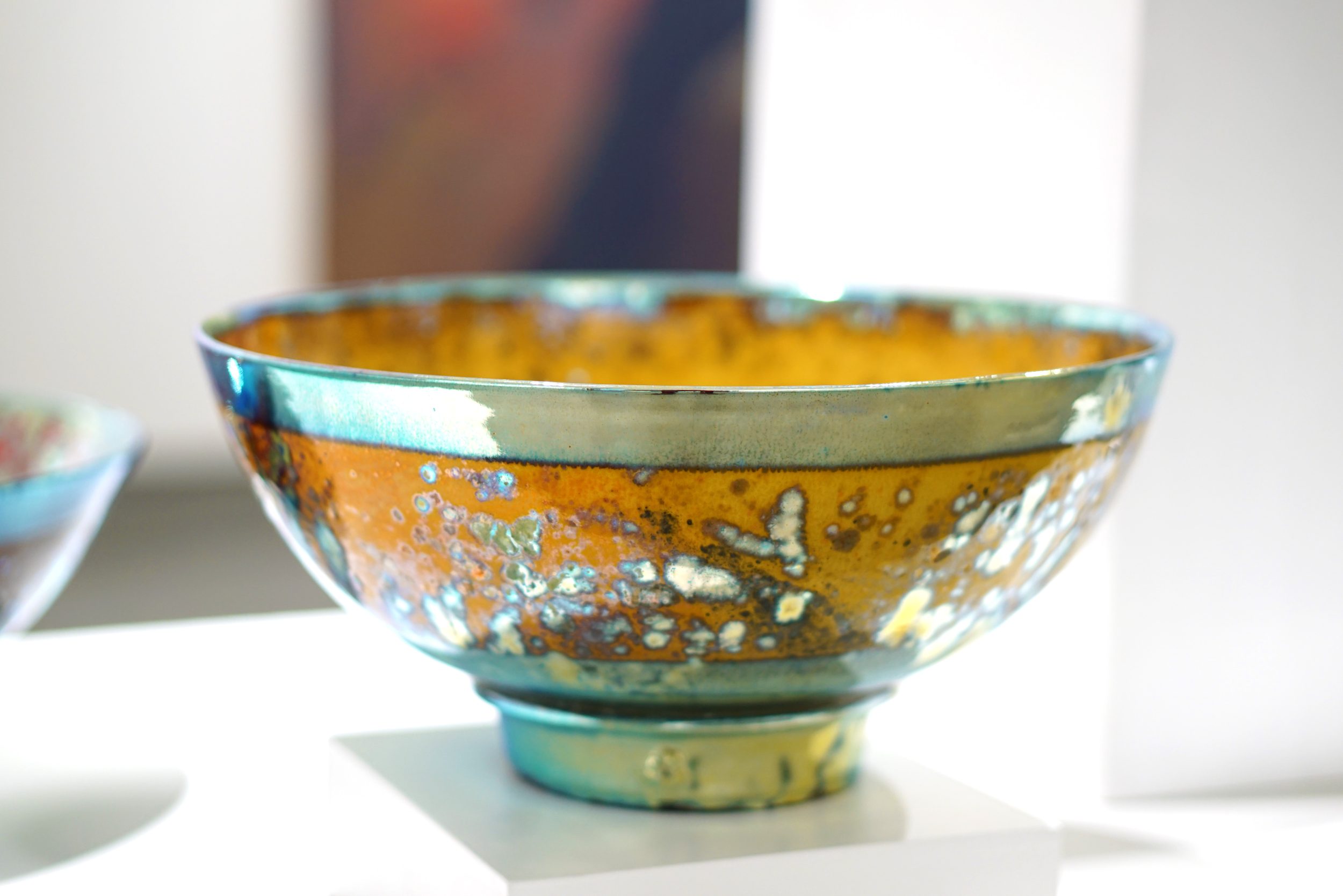 ‘What is Lustreware? In the history of Ceramics Lustreware is defined as `an iridescent metallic surface used in the decoration of ceramics`. It is certainly that – but here it is rather more complicated. Historians believe that the technique of combining precious metals and ceramic glazes first emerged in ancient Egypt when glass – makers attempted to make glass vessels resemble solid metal vessels by coating the surfaces in gold or by incorporating gold into the glass. This may well be the case, for glazed pottery is coated in a film of glass.
