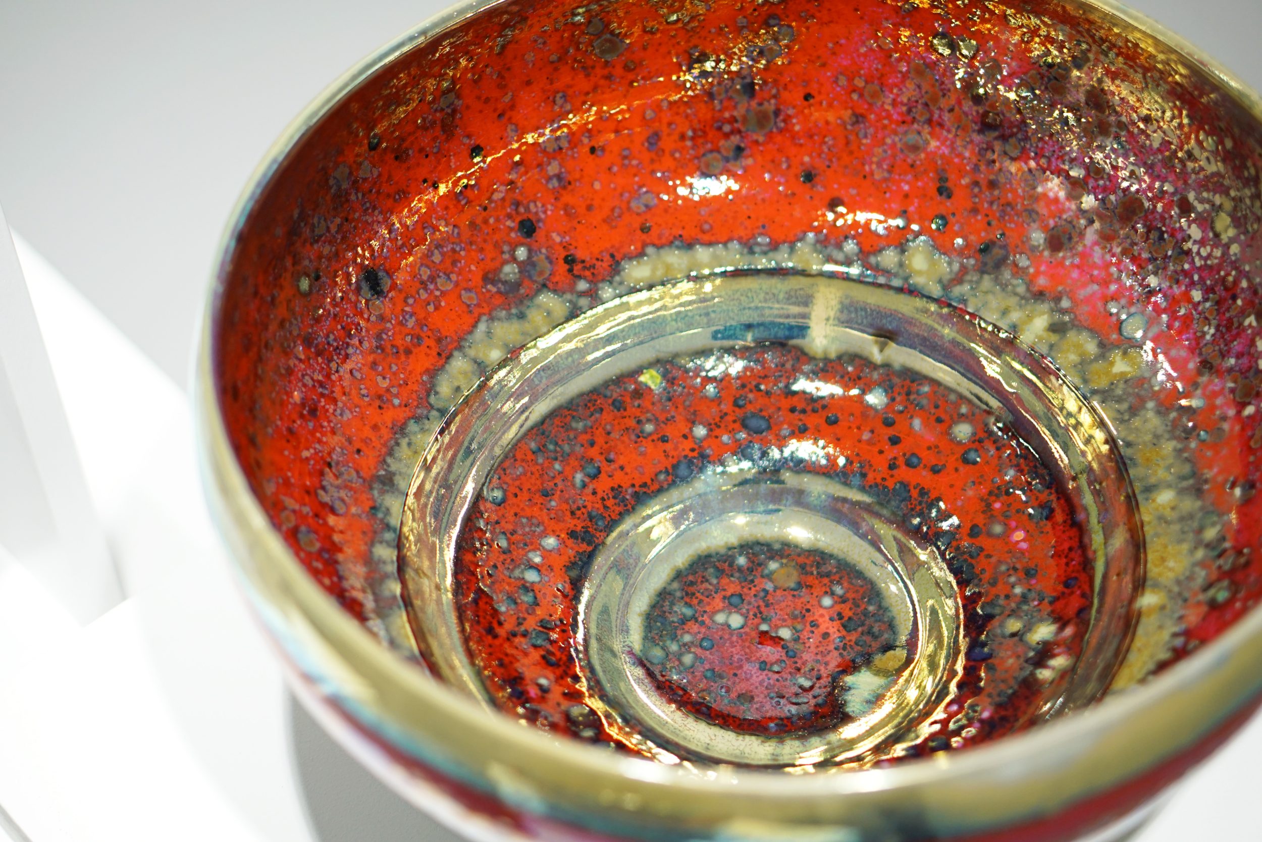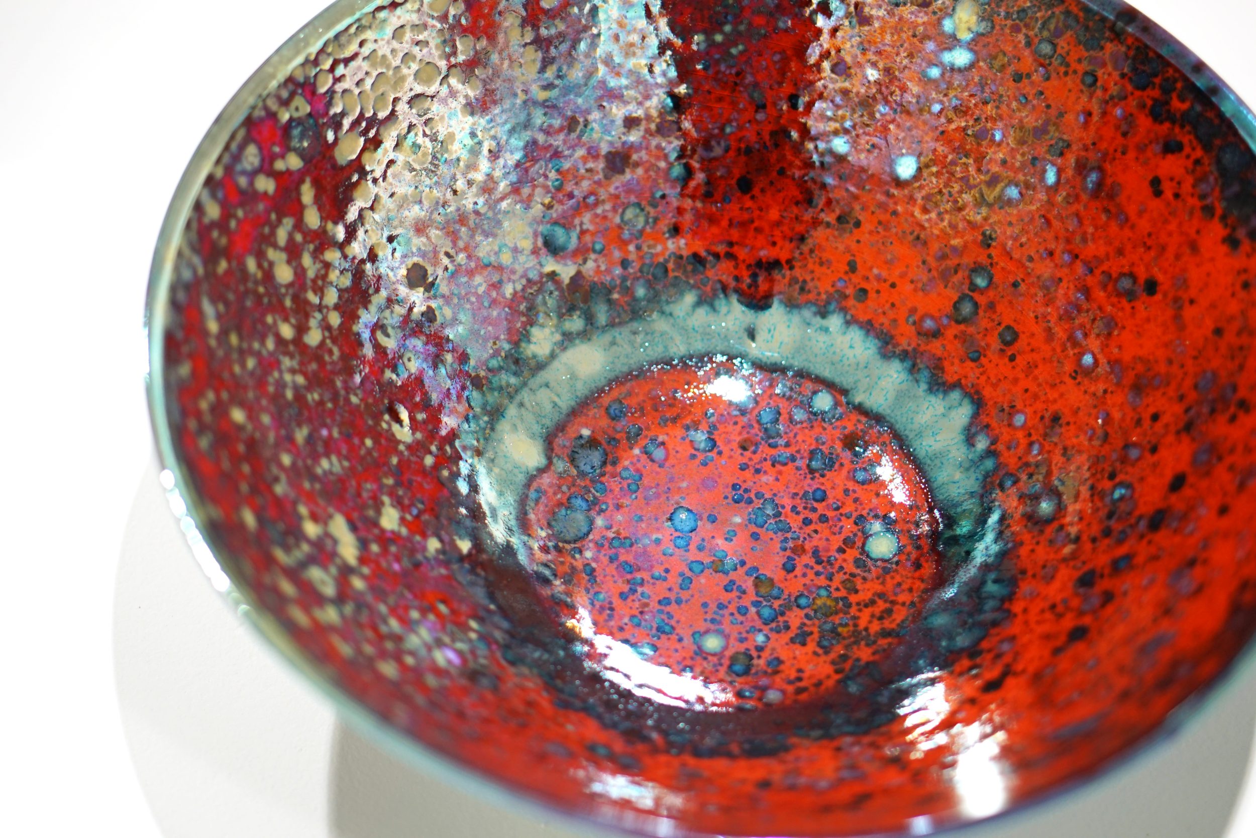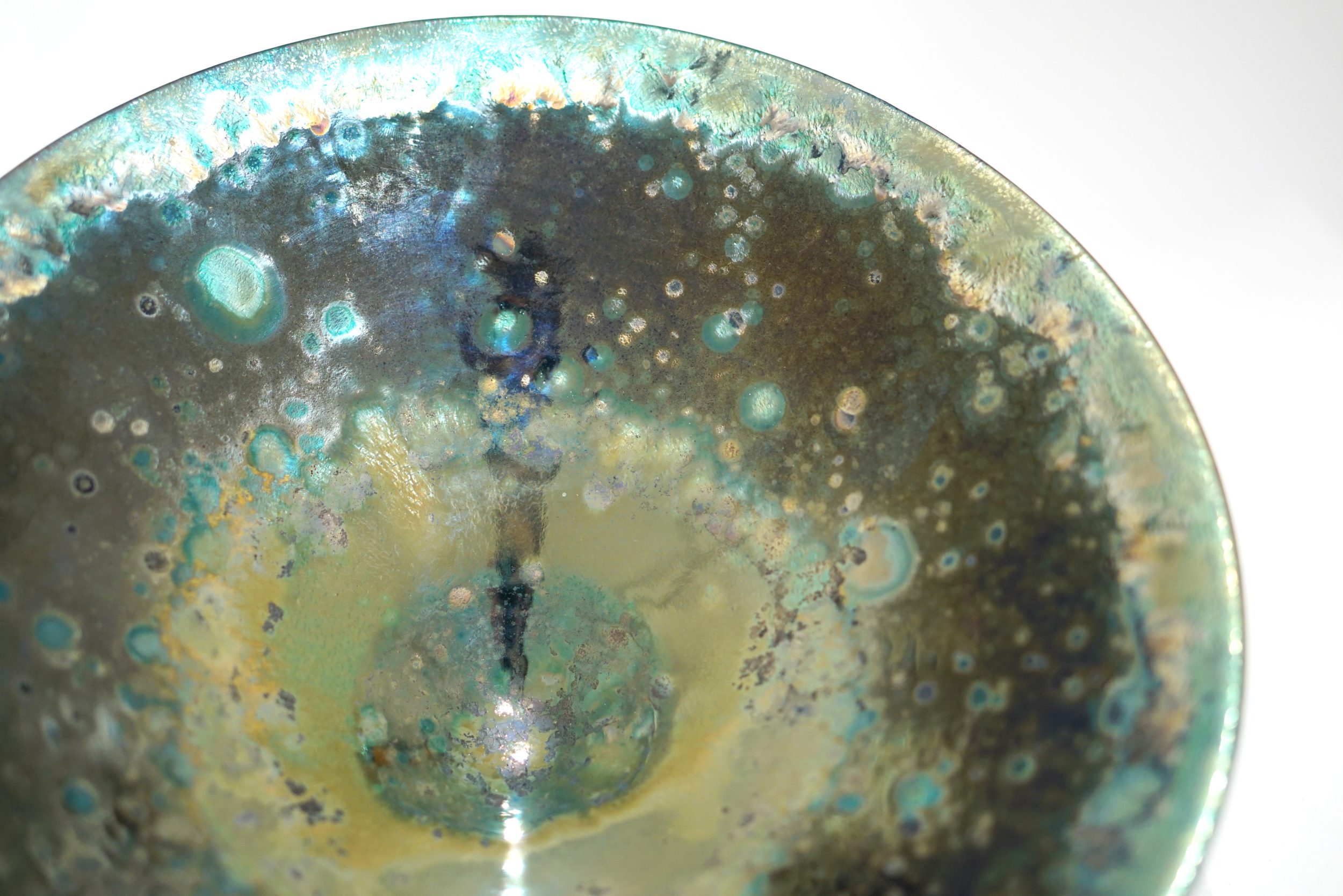Gold, silver and copper are the chief metals used although these may be modified by cobalt, manganese, nickel, chrome and bismuth. The famous tempting ruby reds of history were made with inclusions of mercury. I manage to avoid this. The potters did not live long. These metals are used on the glaze, in the glaze and under the glaze. The metals are used in the form of soluble salts or increasingly in the form of finely powdered pure metal. A high concentration of metal will produce a film of pure metal, less will make solid colours and less will give transparent colours, opalescence and iridescence.