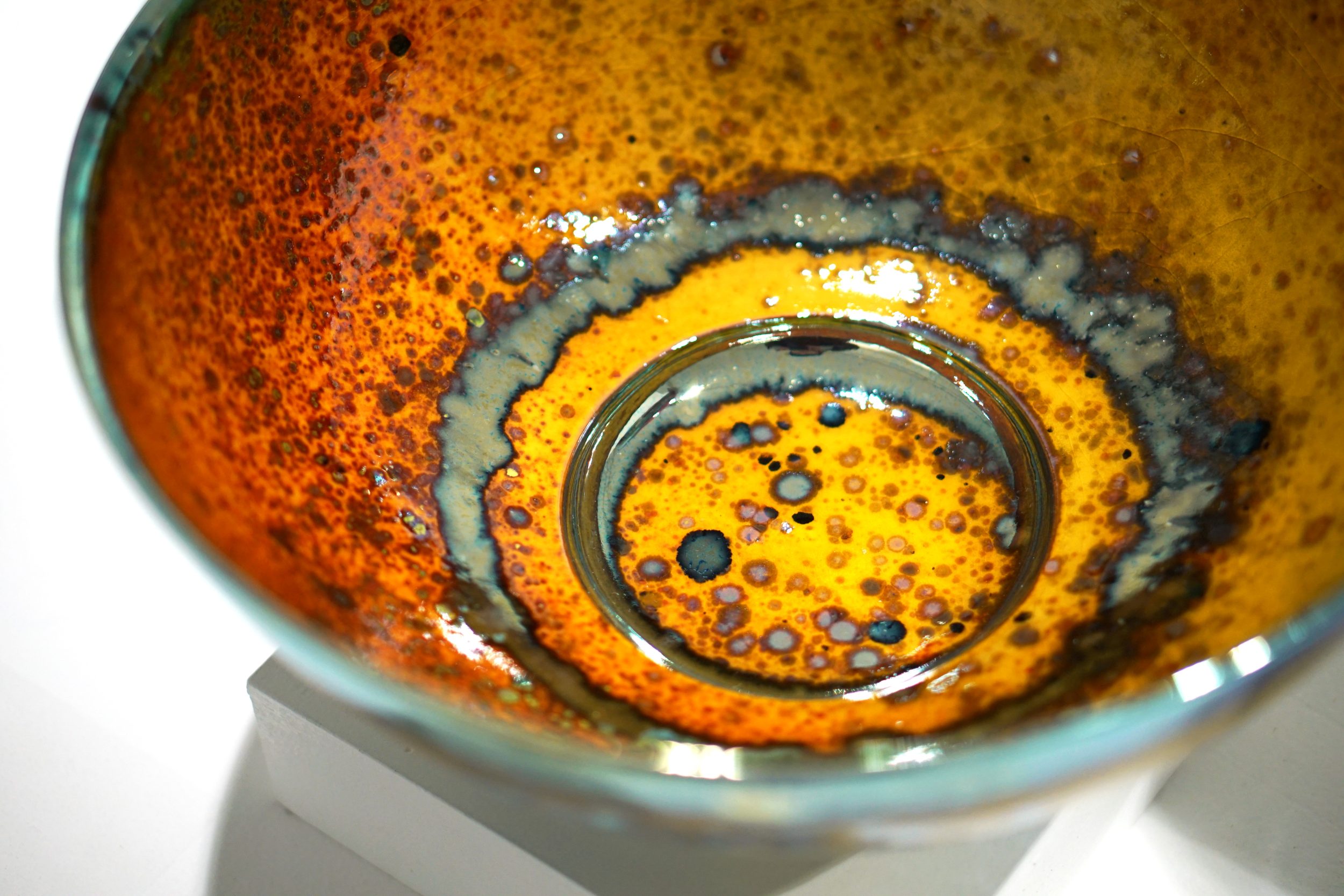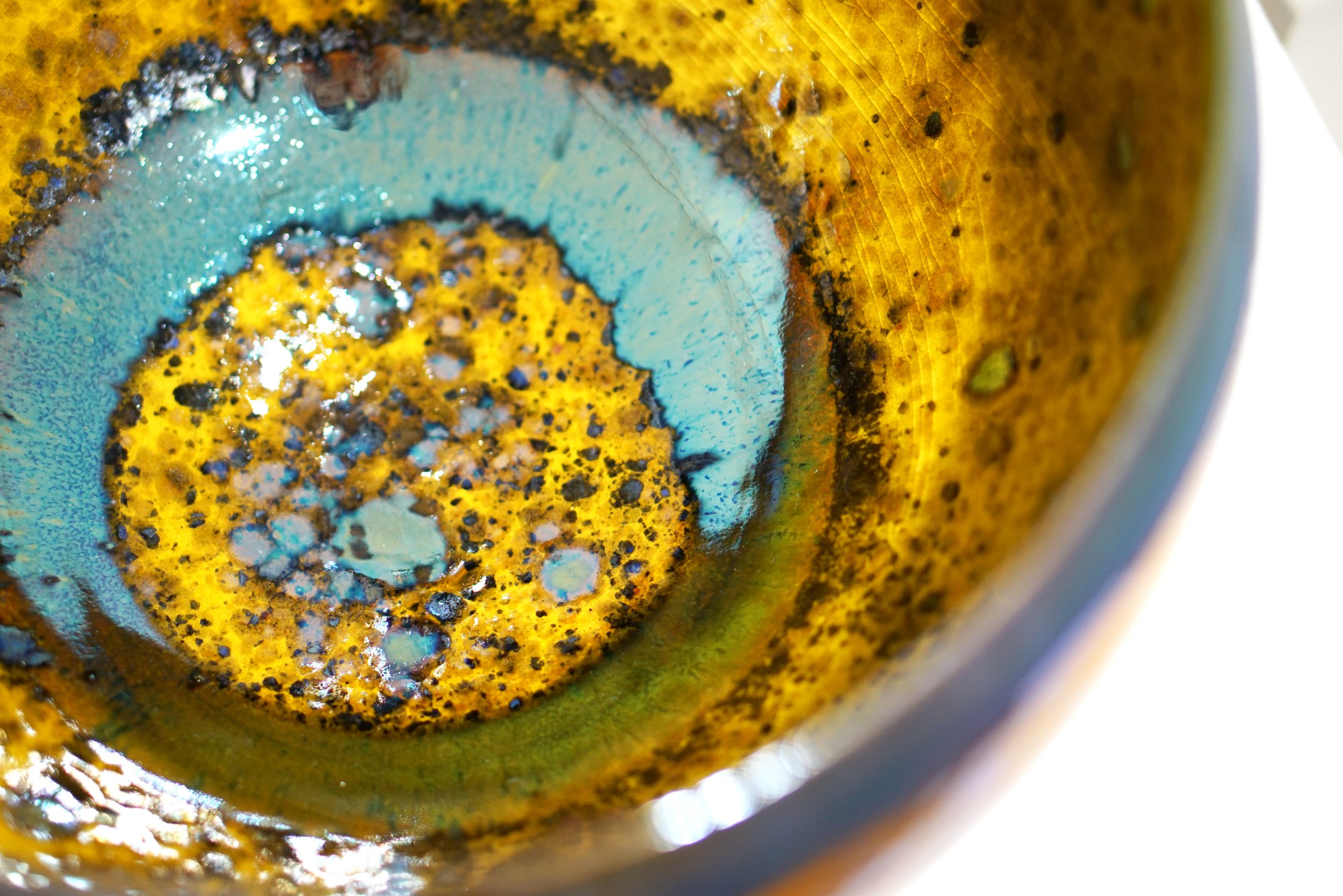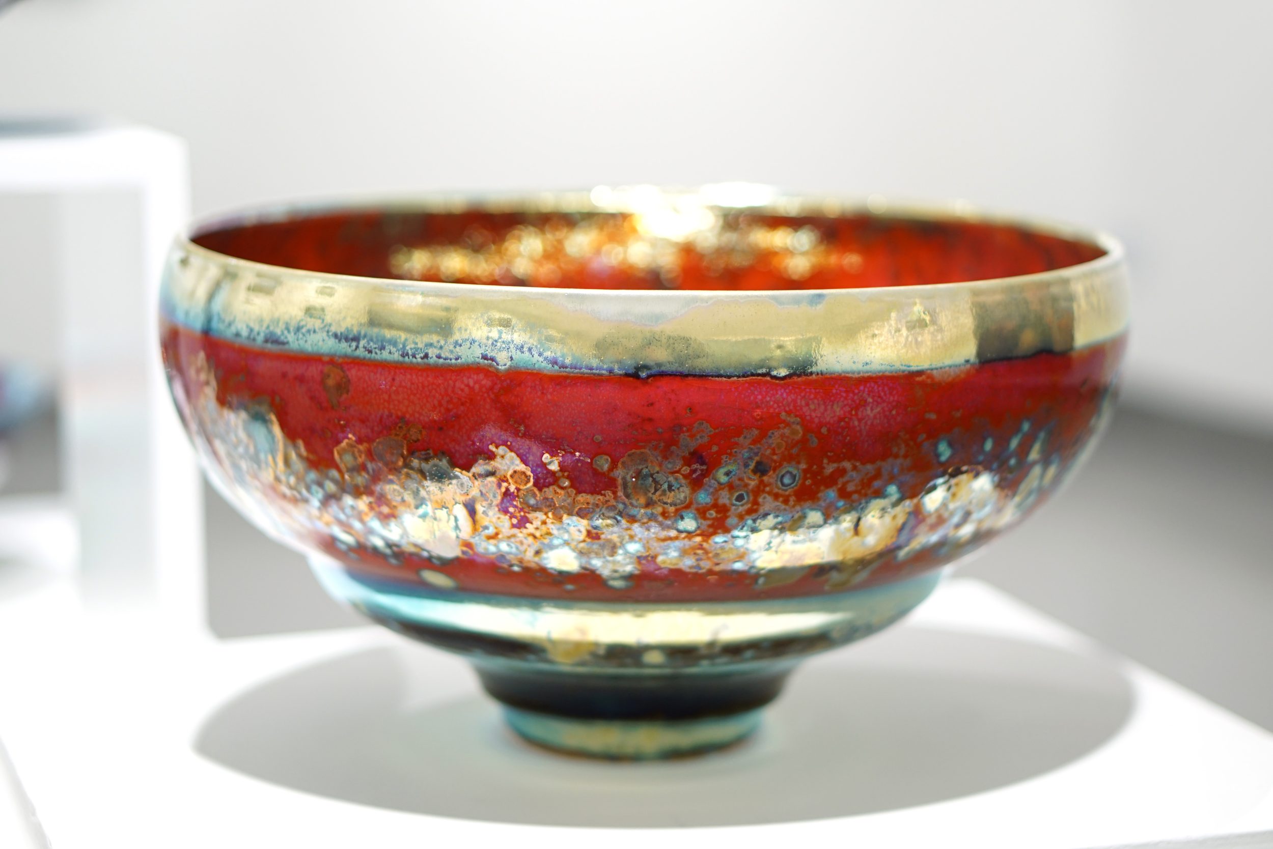Gold, silver and copper are the chief metals used although these may be modified by cobalt, manganese, nickel, chrome and bismuth. The famous tempting ruby reds of history were made with inclusions of mercury. I manage to avoid this. The potters did not live long. These metals are used on the glaze, in the glaze and under the glaze. The metals are used in the form of soluble salts or increasingly in the form of finely powdered pure metal. A high concentration of metal will produce a film of pure metal, less will make solid colours and less will give transparent colours, opalescence and iridescence.
