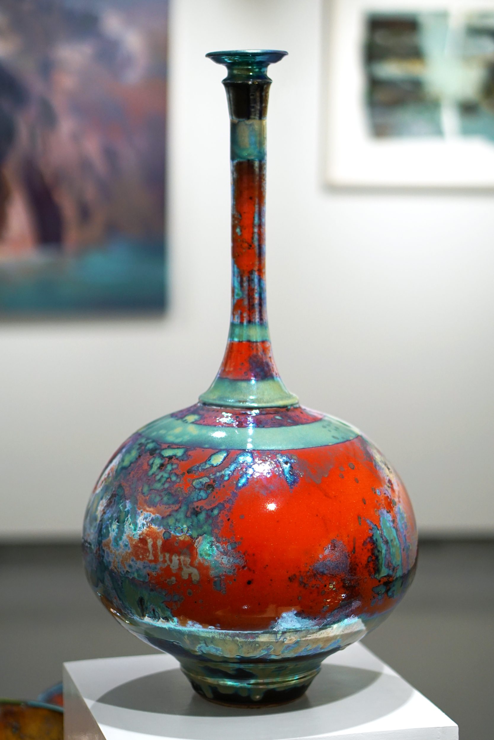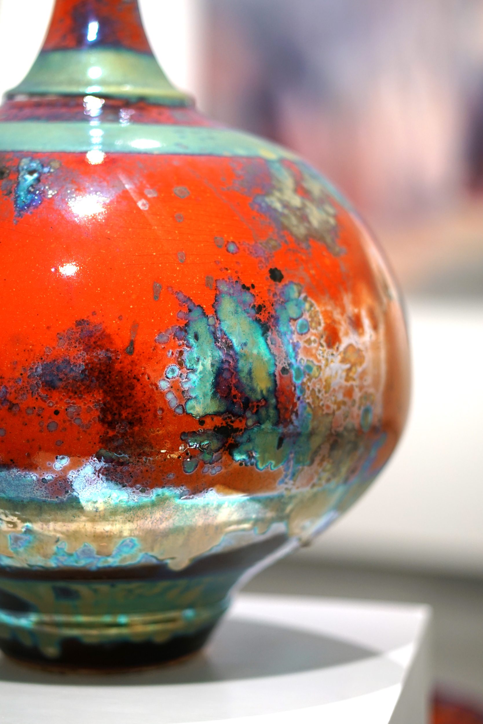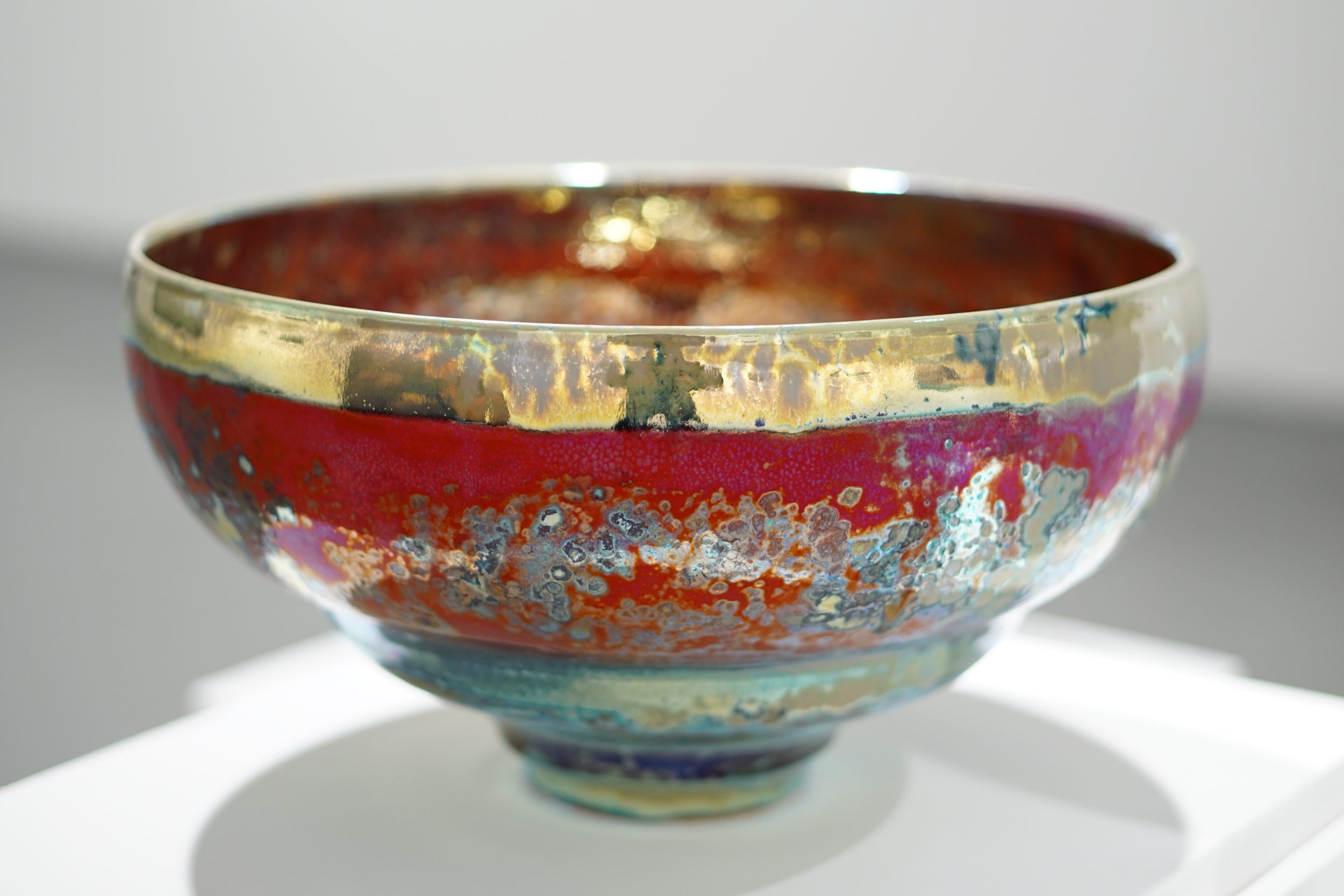 I think I do rather better than one in a hundred, but there is a significantly high failure rate. In the world today there are literally only a handful of potters working successfully in Lustre, although many try and abandon the attempt. Why is this? This is because the technique is capricious and infuriatingly difficult to pull off. Best results happen briefly before the point of destruction, moments before the glazes boil and blister, seconds before the metals volatile and disappear up the chimney and this golden moment must be detected whilst the gases in the kiln are oxygen free. This is made more difficult by the fact that this moment does not always occur at exactly the same temperature and if held too long the lustrous vanish. Too short a time is equally disastrous. Humidity and general weather conditions affect it – so instinct has to be relied upon. After close to forty years of experimentation I continue to be baffled and exasperated by the unpredictability of the technique.