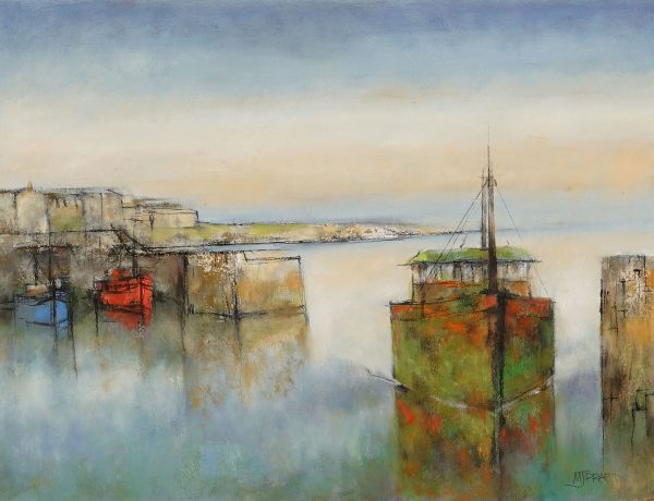 Born in 1941 from a long line of Mousehole luggermen, Michael Praed was educated at Penzance and Falmouth School of Art followed by Brighton College of Art. He is a member of both the Newlyn and Penwith Societies of Art and has exhibited widely, retiring from teaching in 1993 to paint full time. His work ranges from large paintings of landscape and sea to smaller images depicting familiar friendly scenes of Cornishmen at work; from long lonely beaches to the bustle of a fish market, but always illustrating his observational and technical skills as both a painter and draughtsman to marvellous effect.